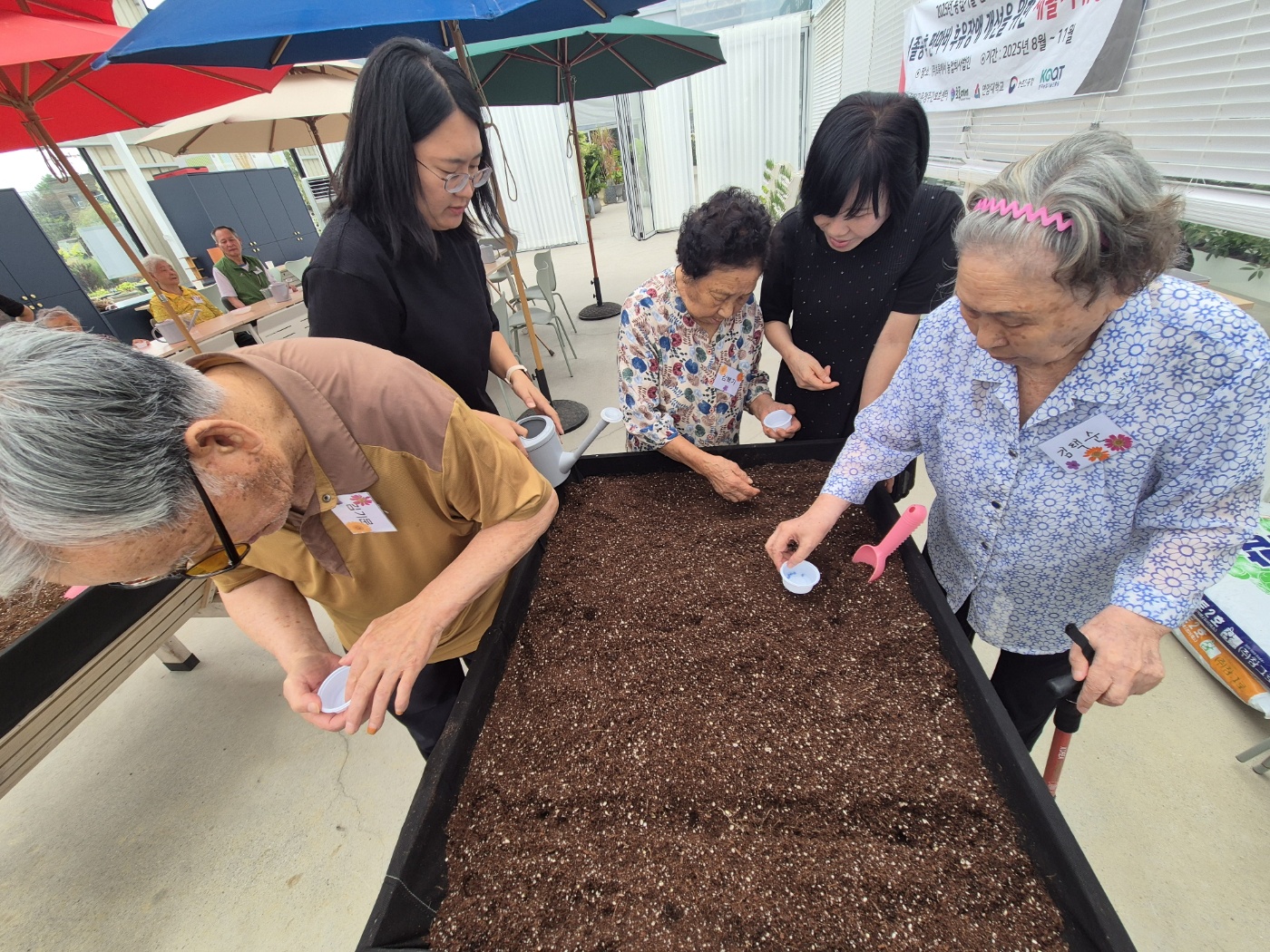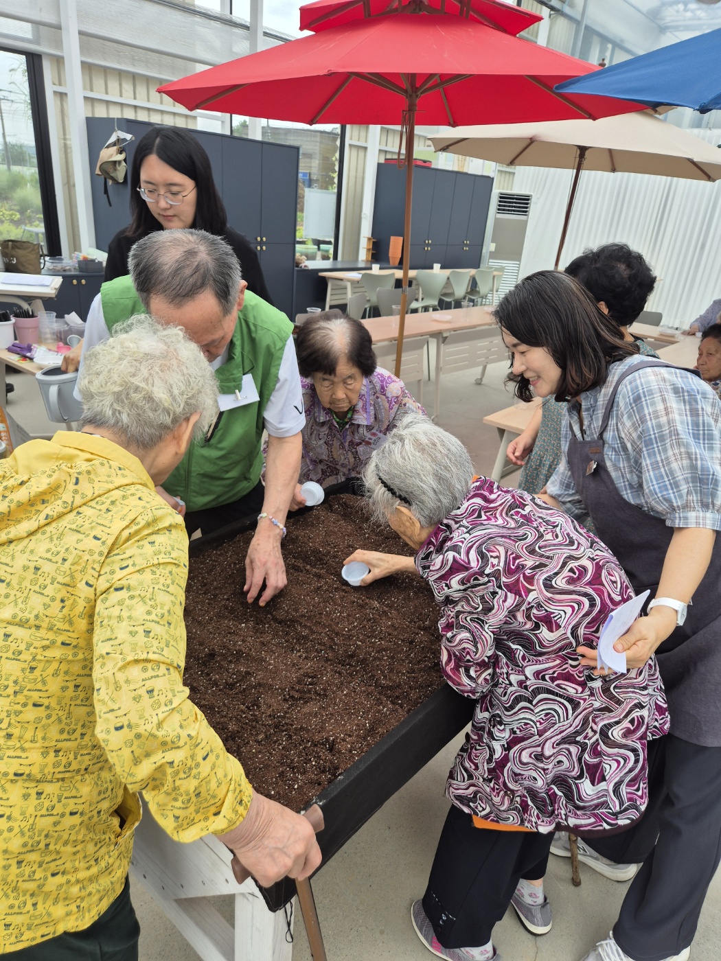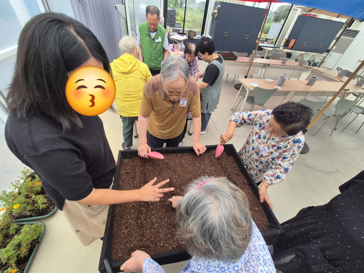 ”우리 어르신들이 초록에서 재활치유 농업을 통해 직접 흙을 만지고 쪽파, 상추, 꽃 등을 심으며 자연 속에서 활력을 되찾고 있습니다.